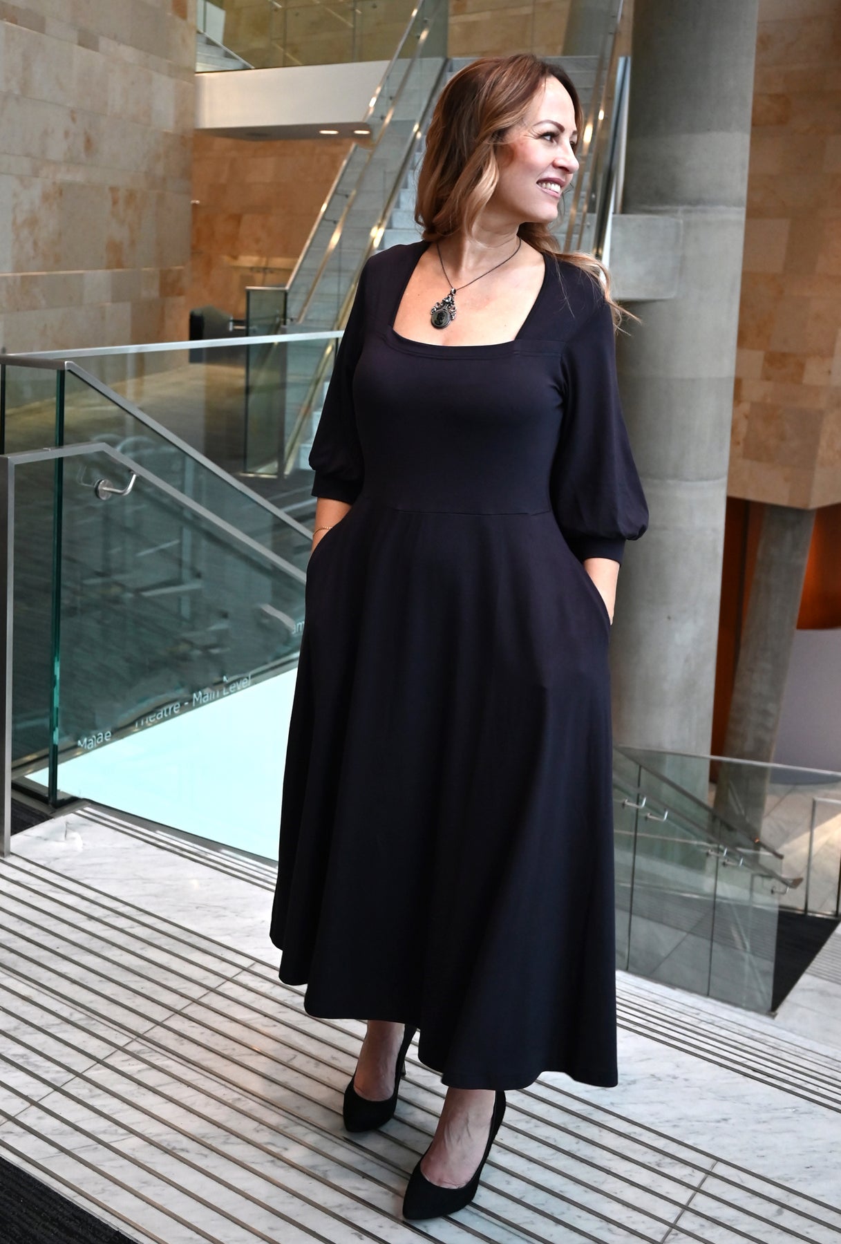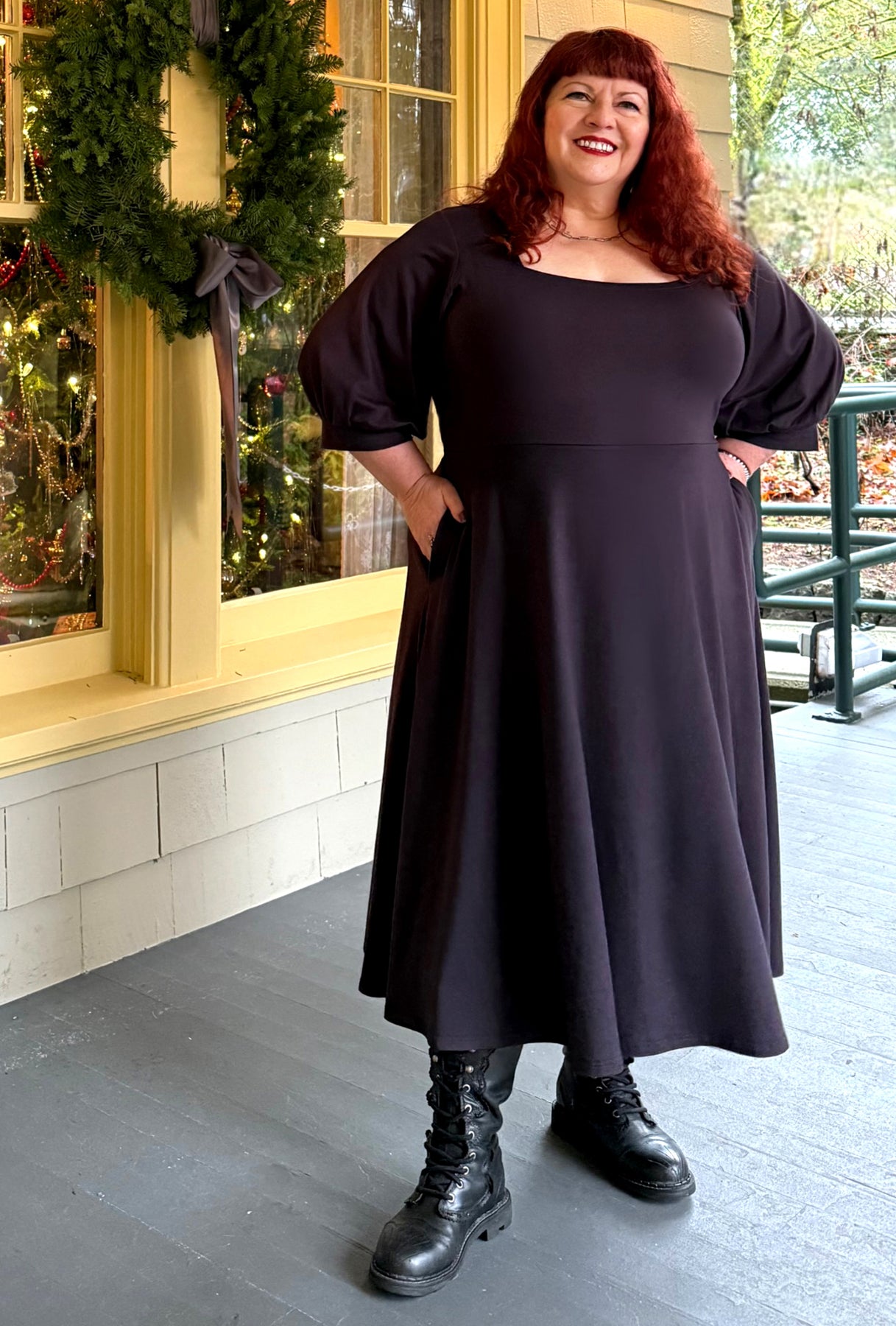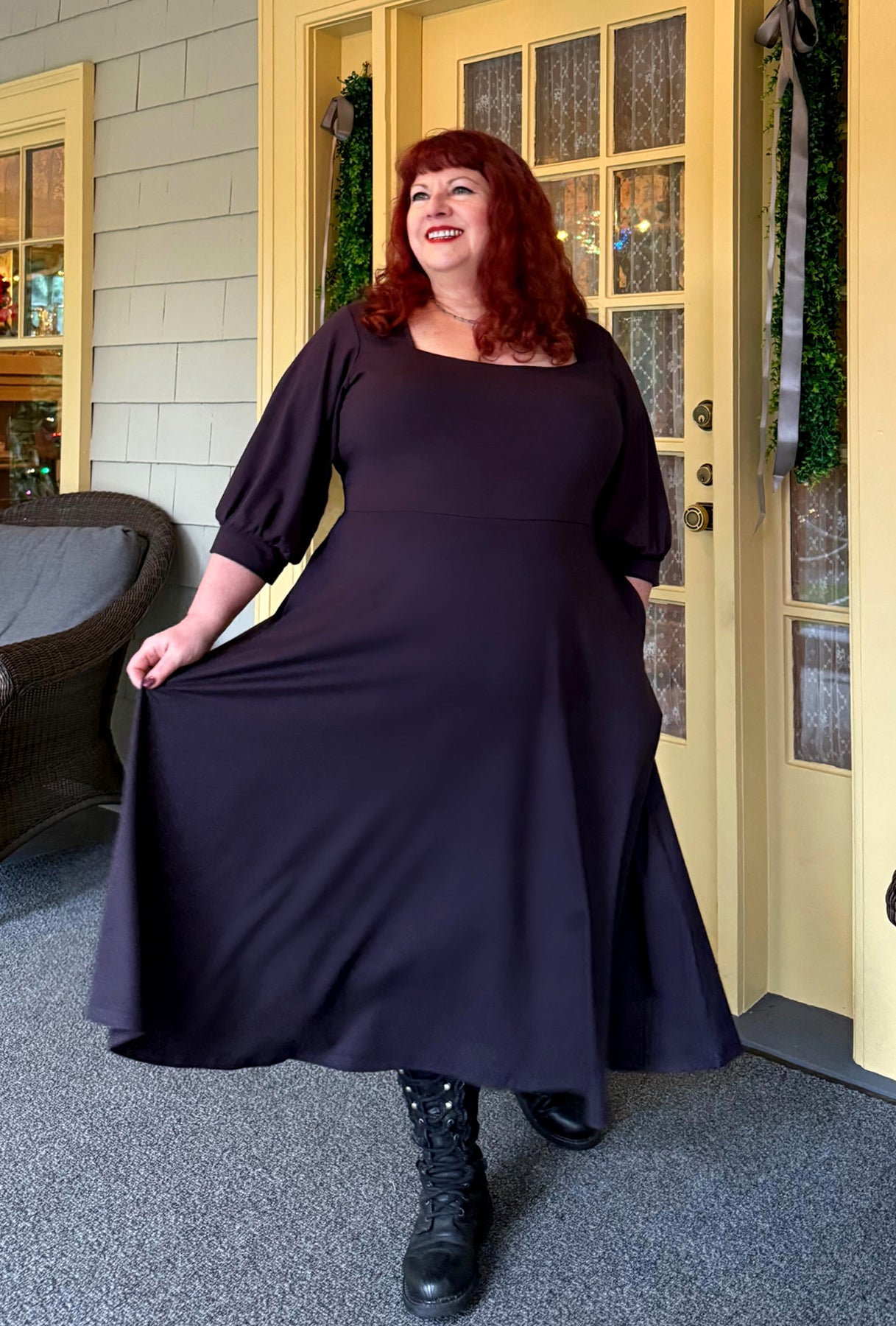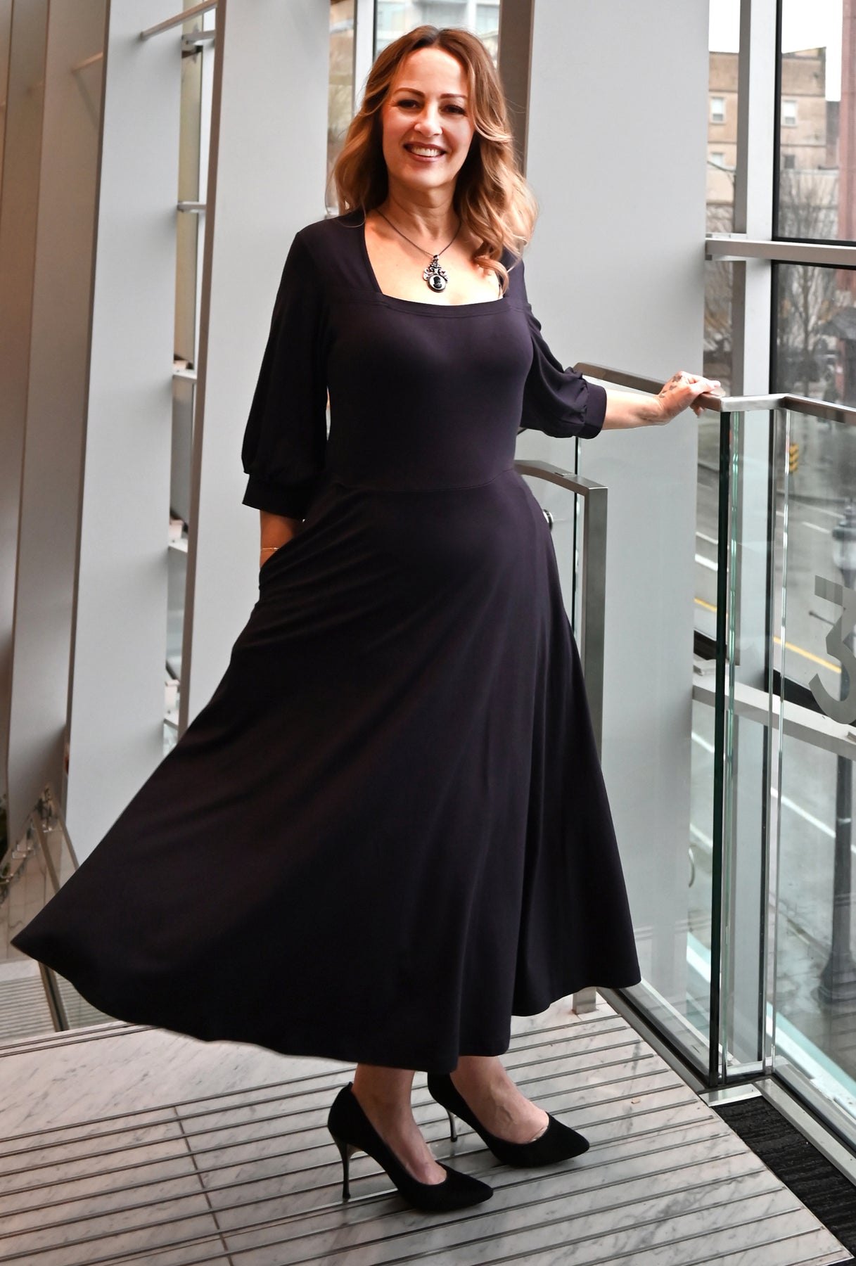Step into your story with the Willow dress, an effortlessly versatile midi style made for every chapter of your day. This beauty boasts a flattering square neckline, full three-quarter sleeves gathered into cuffs, and a swingy full skirted silhouette with hidden pockets.  Made from luxuriously soft, sustainably-sourced bamboo knit, it feels incredible against your skin while supporting the planet. From your workdays to romantic evenings under the stars, the Willow transitions effortlessly through every moment of your life. It's the dress that adapts to you—playful, practical, and absolutely enchanting.