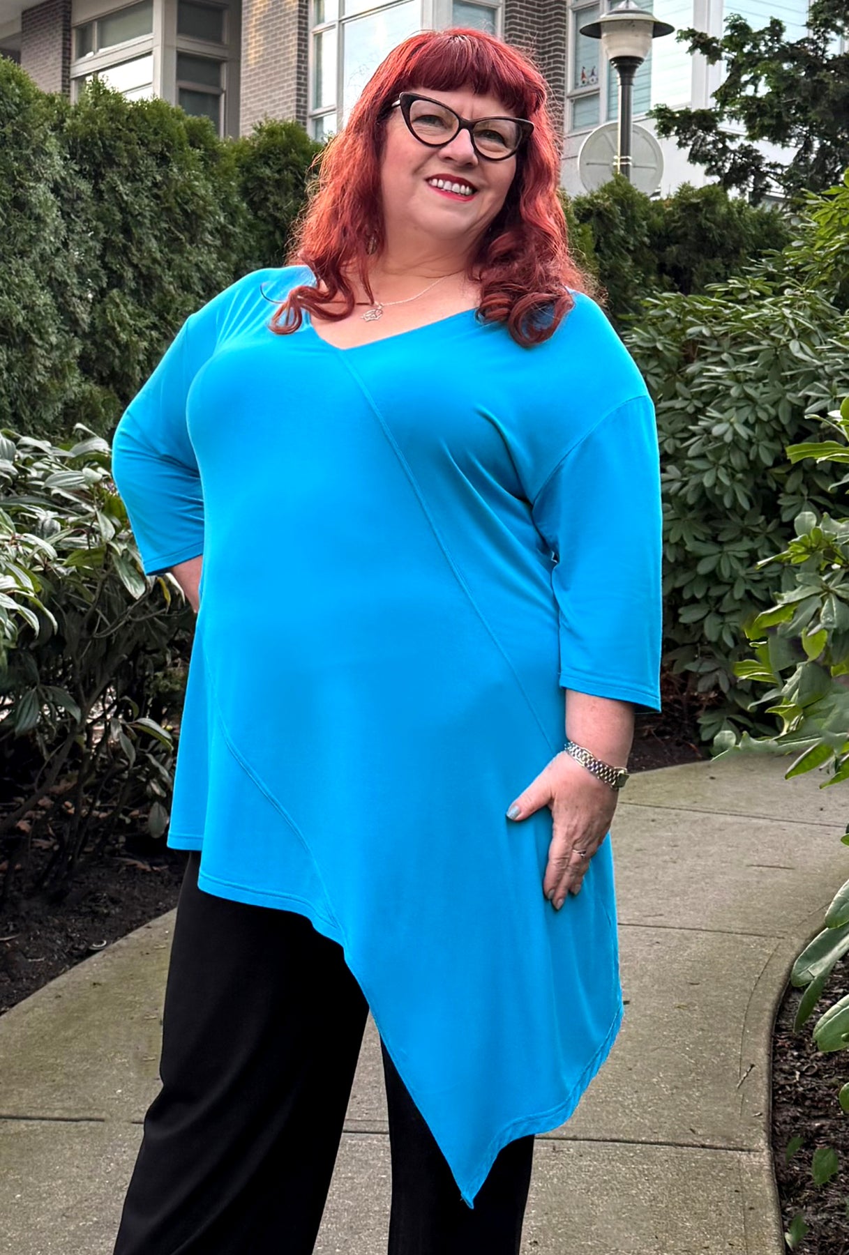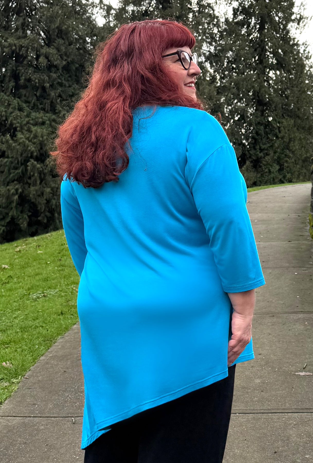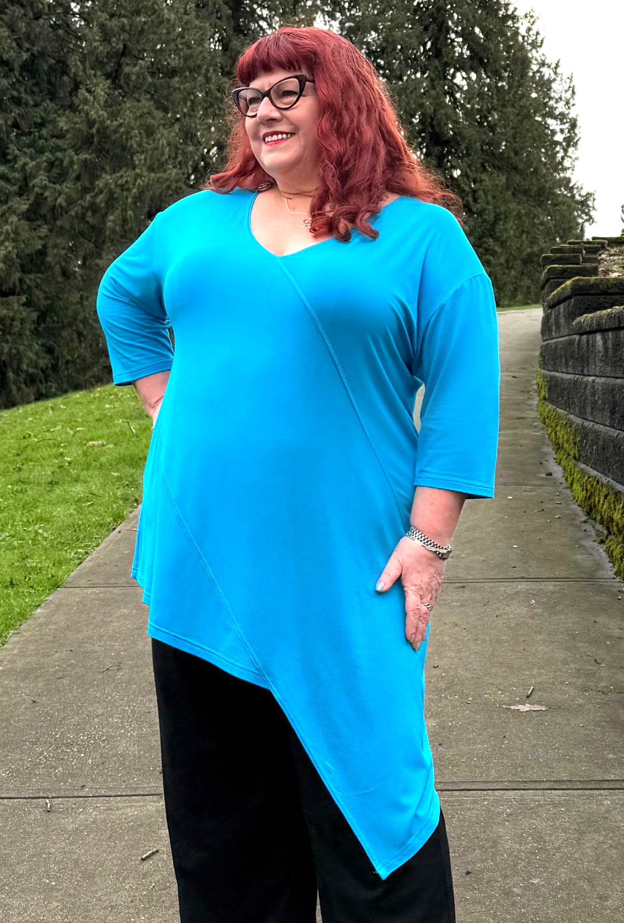 If you’ve been searching for a longer, contemporary asymmetrical tunic in vibrant jewel tones, this could be the perfect choice! It features a flattering V-neck, diagonal seam accents, and a deeply pointed off-center hem that gently slopes back toward the front. With 3/4 sleeves and a length that comfortably covers both your tummy and backside, it offers both style and coverage. This tunic stands out because it reveals a unique look from every angle!