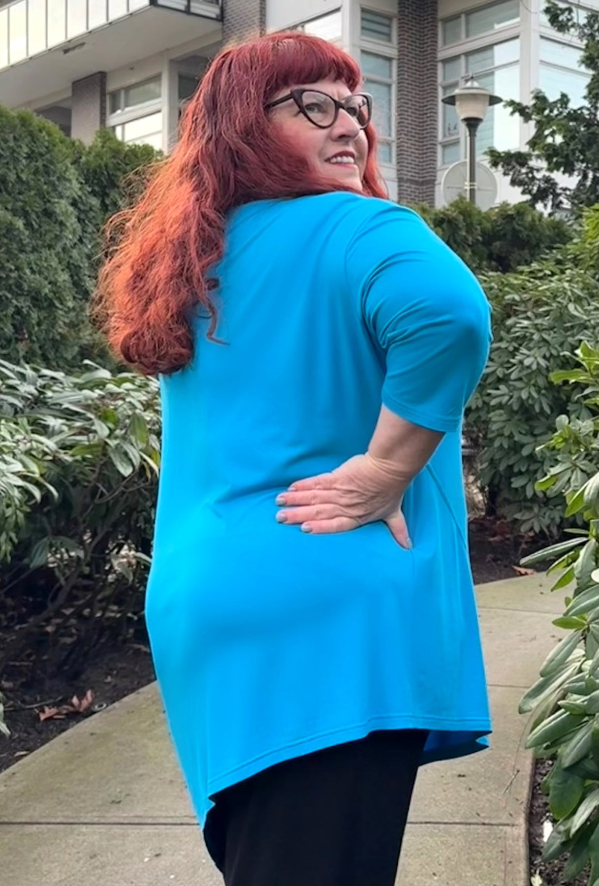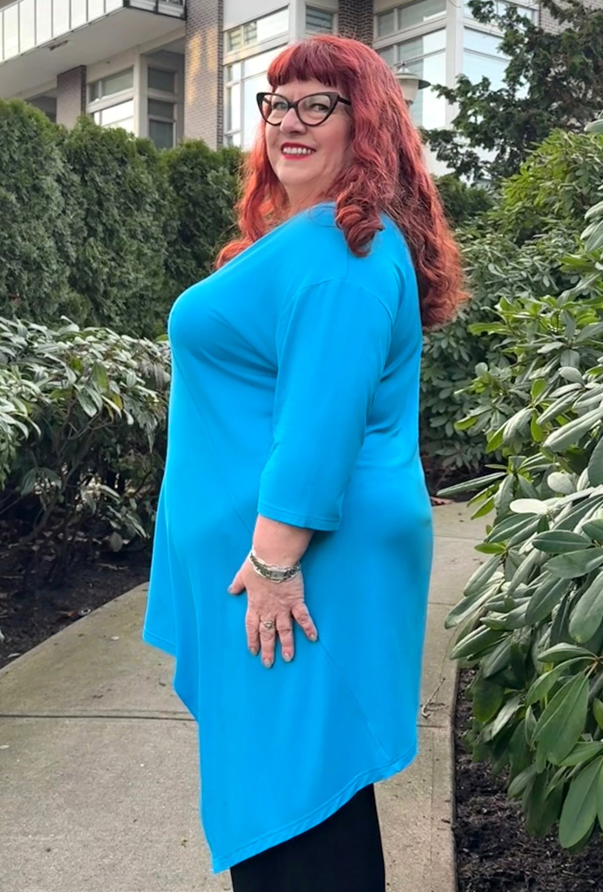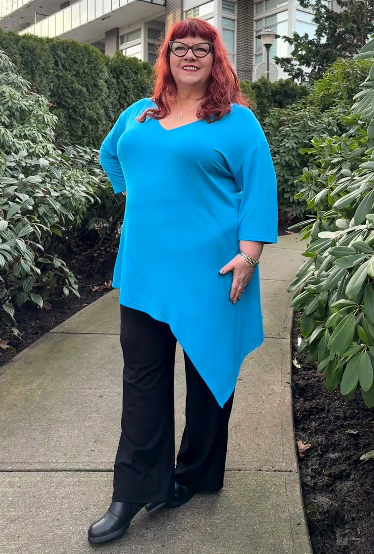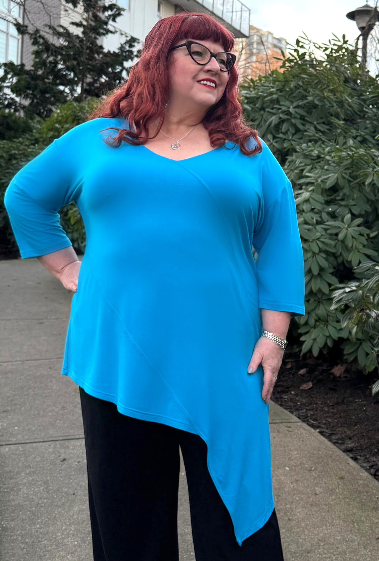 If you’ve been searching for a longer, contemporary asymmetrical tunic in vibrant jewel tones, this could be the perfect choice! It features a flattering V-neck, diagonal seam accents, and a deeply pointed off-center hem that gently slopes back toward the front. With 3/4 sleeves and a length that comfortably covers both your tummy and backside, it offers both style and coverage. This tunic stands out because it reveals a unique look from every angle!