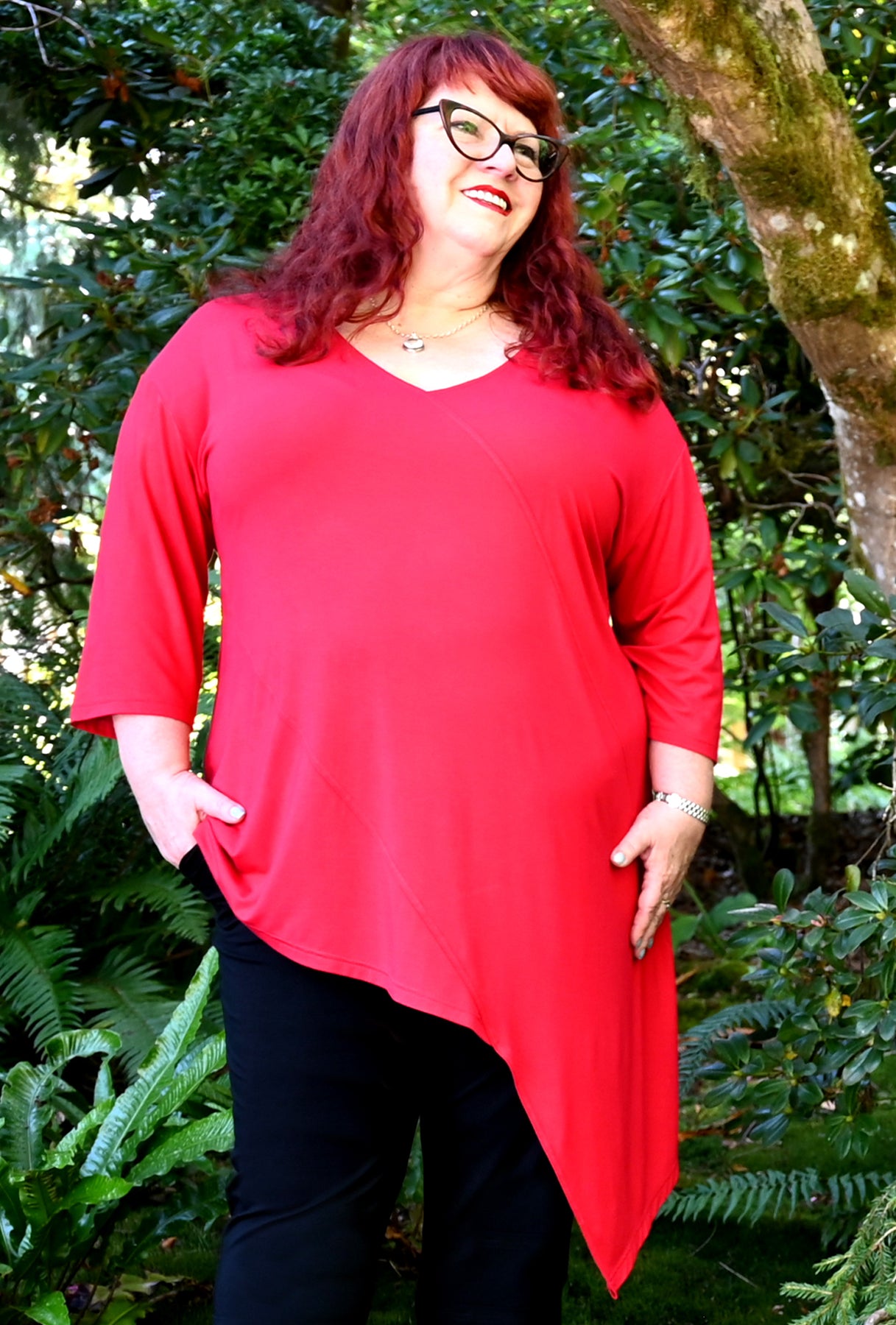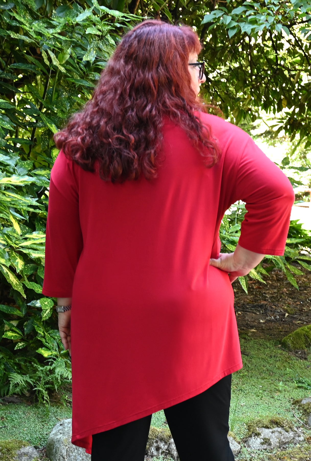If you’ve been searching for a longer, contemporary asymmetrical tunic in vibrant jewel tones, this could be the perfect choice! It features a flattering V-neck, diagonal seam accents, and a deeply pointed off-center hem that gently slopes back toward the front. With 3/4 sleeves and a length that comfortably covers both your tummy and backside, it offers both style and coverage. This tunic stands out because it reveals a unique look from every angle!