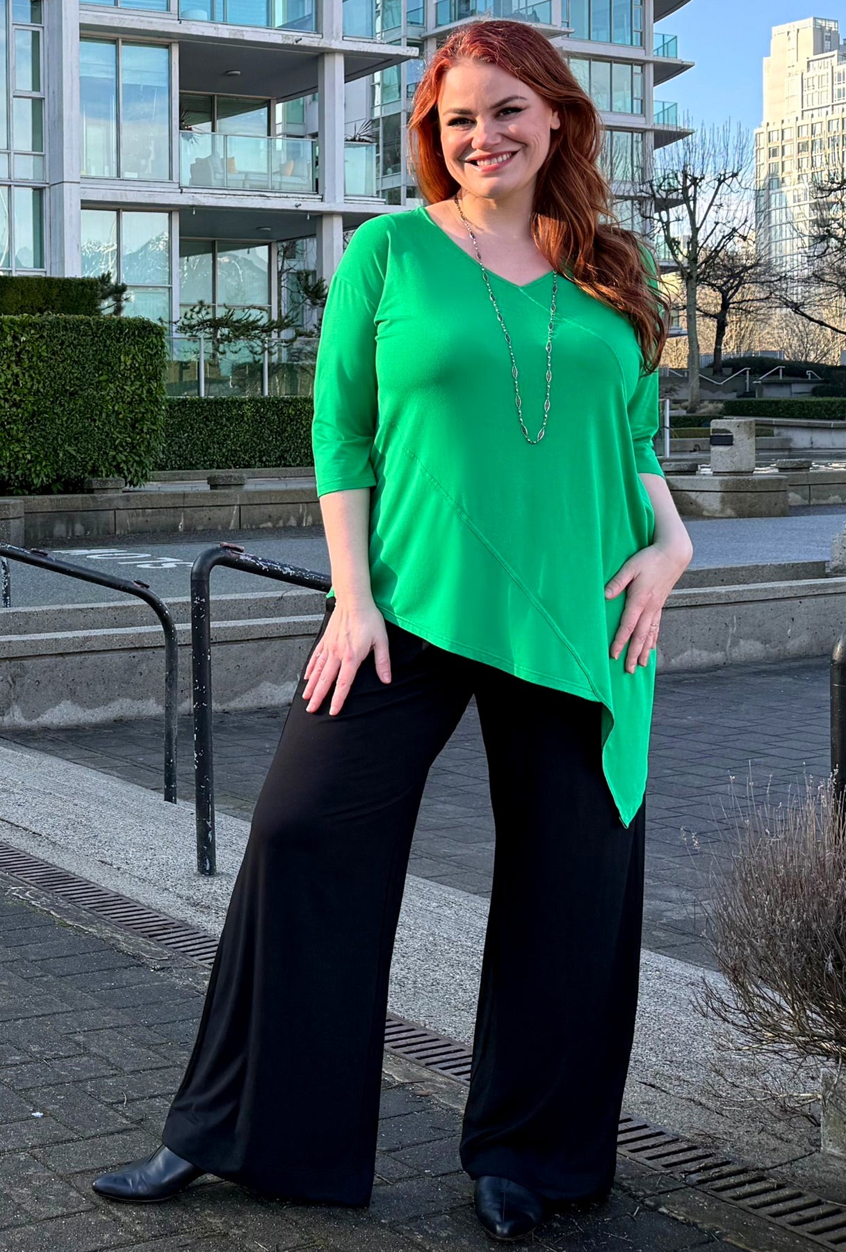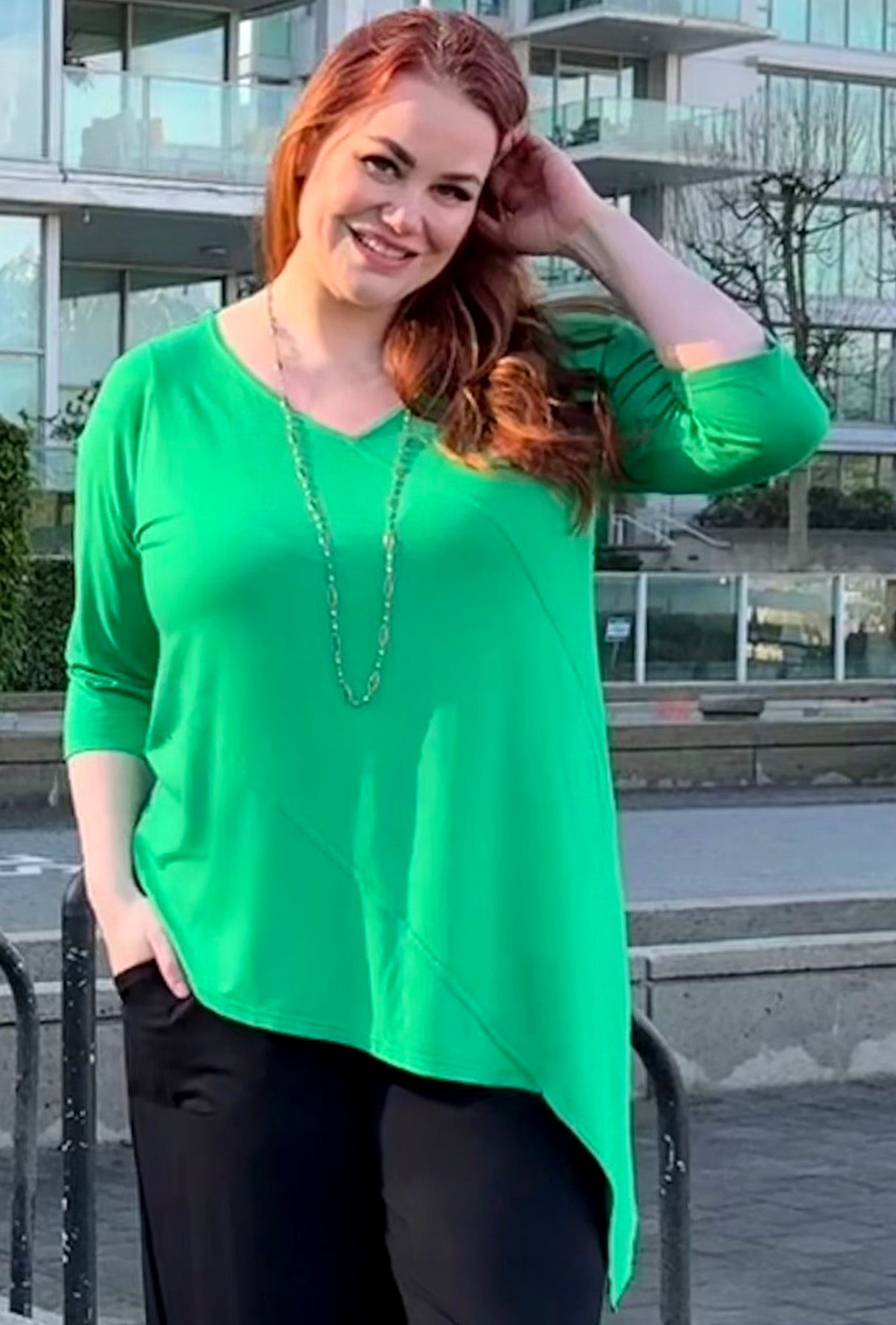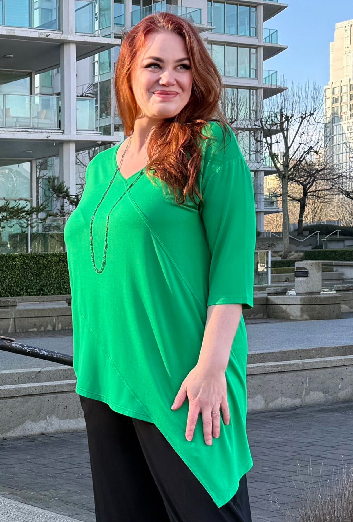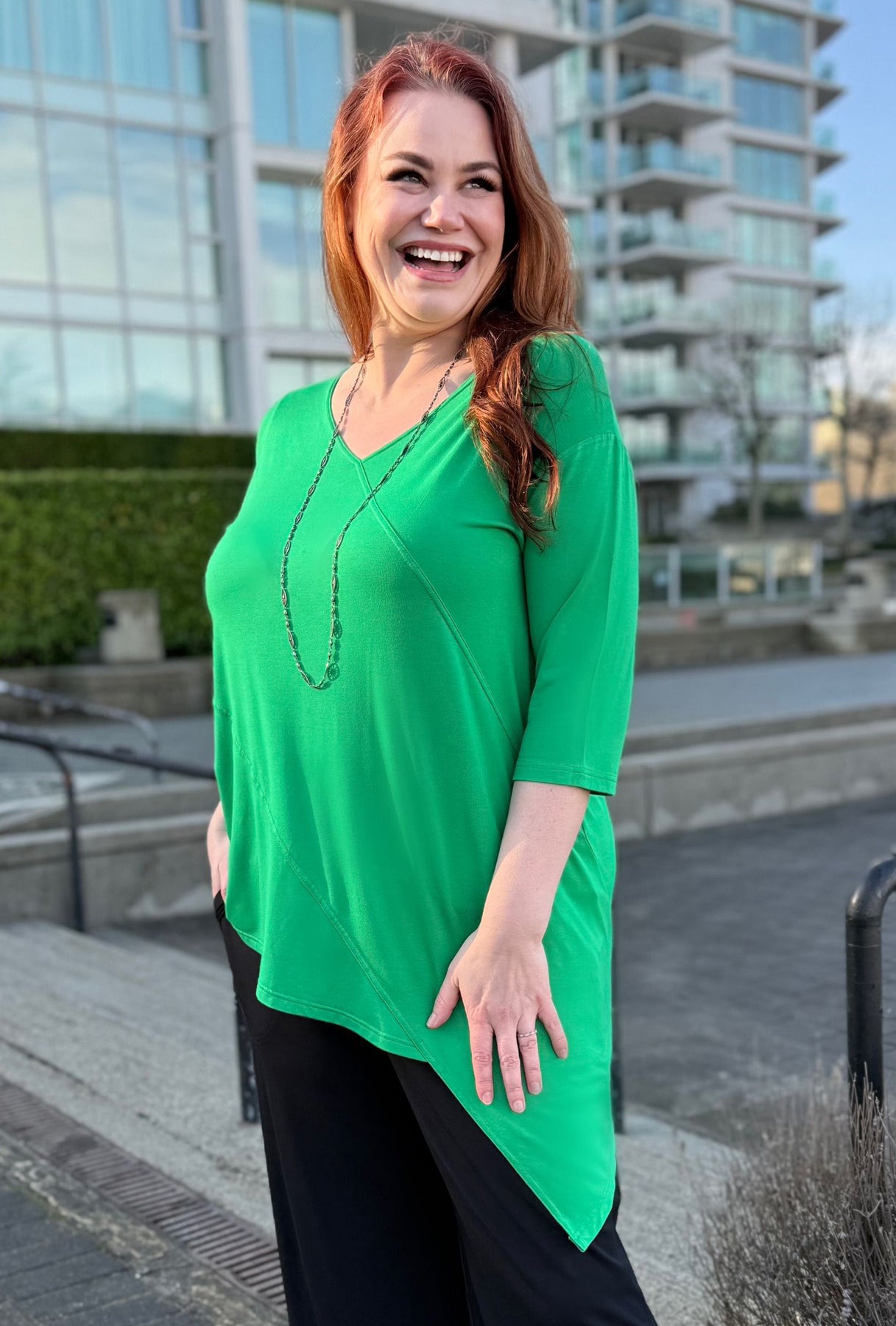 If you’ve been searching for a longer, contemporary asymmetrical tunic in vibrant jewel tones, this could be the perfect choice! It features a flattering V-neck, diagonal seam accents, and a deeply pointed off-center hem that gently slopes back toward the front. With 3/4 sleeves and a length that comfortably covers both your tummy and backside, it offers both style and coverage. This tunic stands out because it reveals a unique look from every angle!