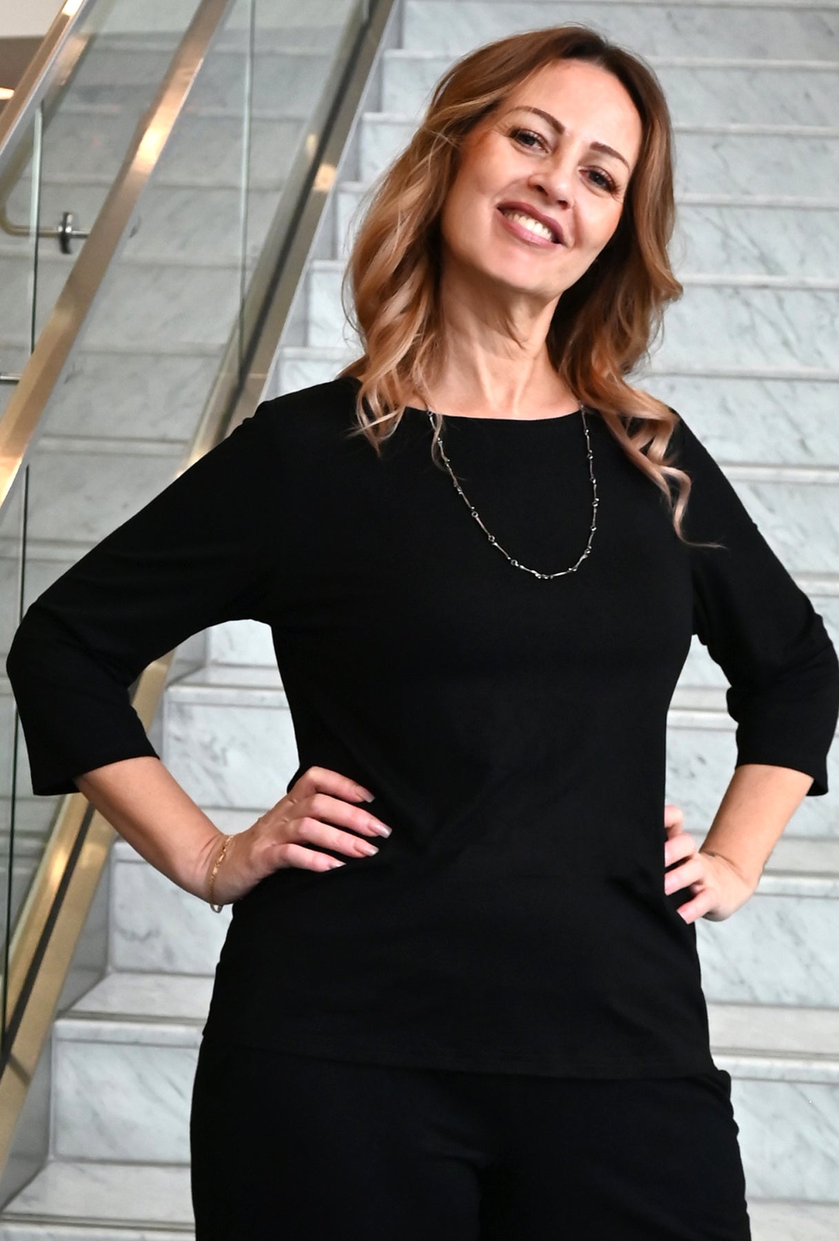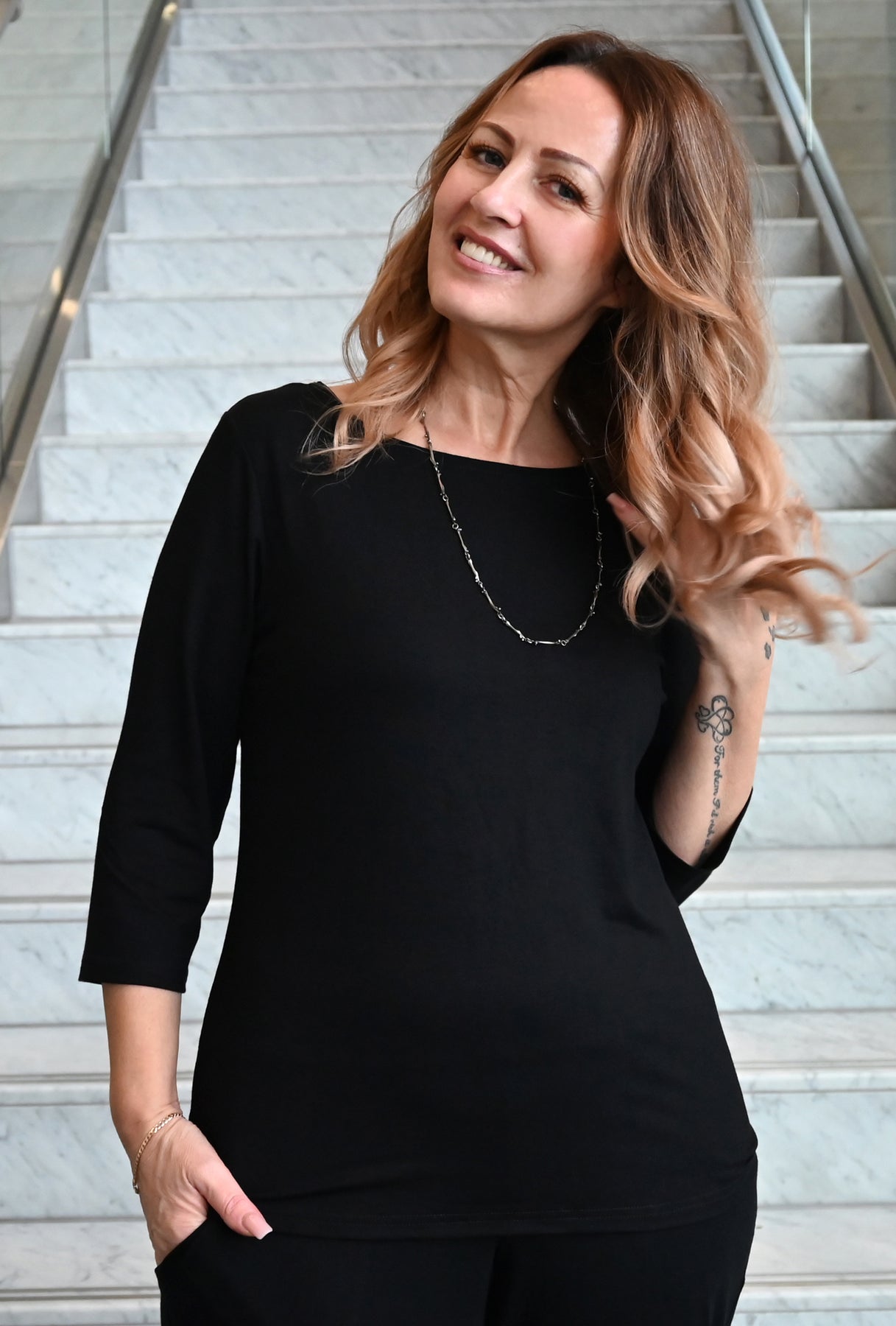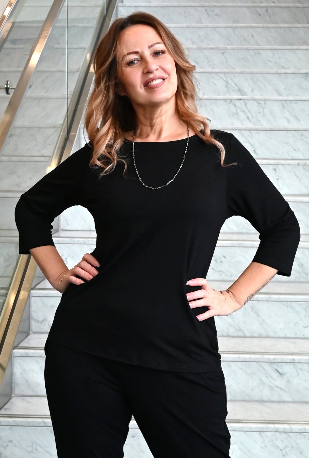 One of our most essential items has to be the Perfect Tee.  A timeless classic with a gentle scoop neck, 3/4 length sleeves, and a hem that hits in just the right spot, the Perfect Tee is just what you need under everything. Of course, it looks great on its' own too.