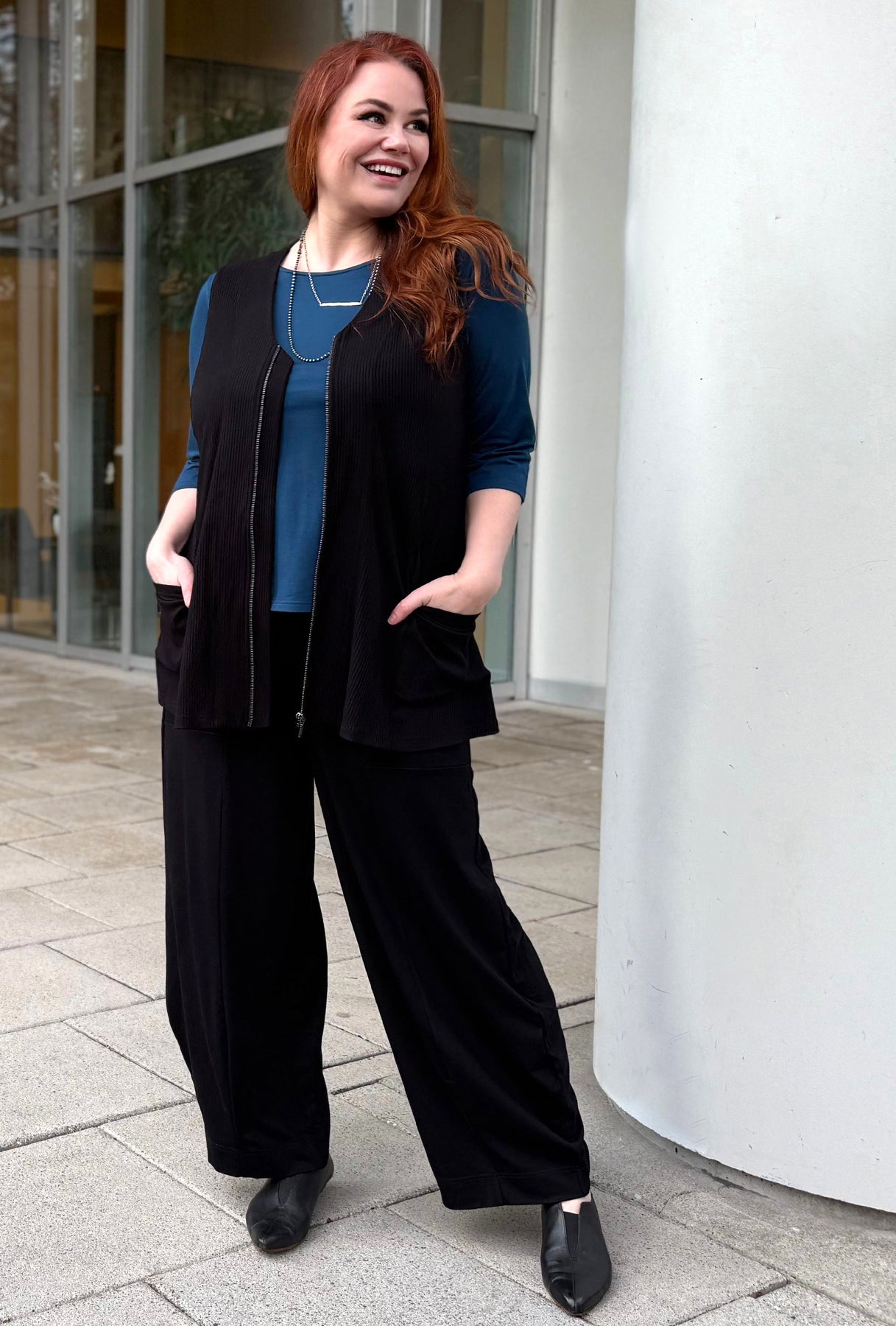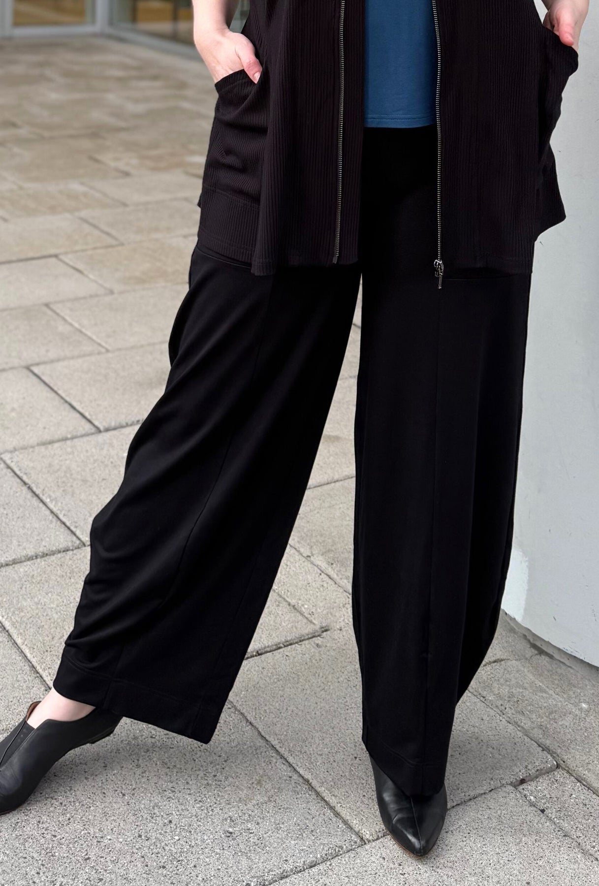 Give your style a modern edge with the wider leg Apex Pant. We've included strategic darts that 'angle' in slightly to narrow the hem into a new modern shape and generous pockets to keep your essentials close by. Our original contoured pull on waistband holds its shape and gives you a smooth fit under your tops as always. Built off the pattern of our classic Serene pant, they feature the same fit and leg width.